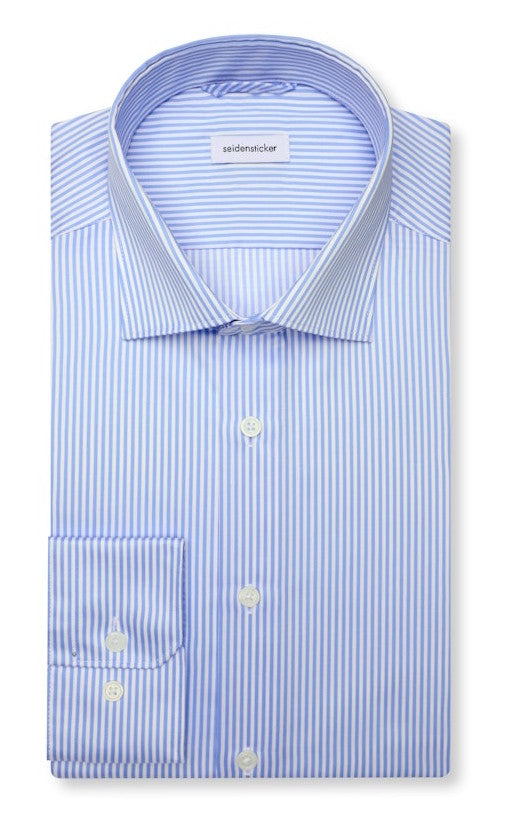 De New Kent boord is een moderne variant van de straight point boord, waarbij de punten licht naar buiten wijzen. Het kan gedragen worden met stropdas of vlinderdas, maar kan ook zonder gedragen worden. Met de slim fit pasvorm, de extra (mouw)lengte en New Kent kraag is dit lichtblauw gestreepte overhemd van Seidensticker een overhemd met een bijzonder draagcomfort. Het overhemd is gemakkelijk te strijken dankzij de easy-iron eigenschappen.