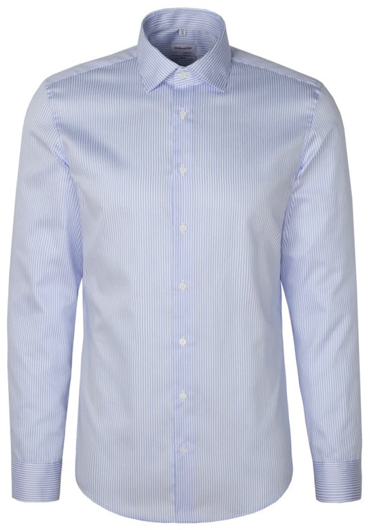 ST.645085.11-38Gestreept blauw overhemd met extra lange mouwen (mouwlengte 7) en extra ruglengte van Seidensticker overhemden. Het blauwe, gestreepte overhemd is eenvoudig te combineren met andere kleuren. Het overhemd is slank uitgesneden en sluit goed aan op het lichaam. Dit maakt het een keurig en stijlvol overhemd. Comfort gecombineerd met de fijne kwaliteit maakt dit het perfecte hemd voor de langere man. De overhemden zijn getailleerd en hebben daarmee een slim fit pasvorm.