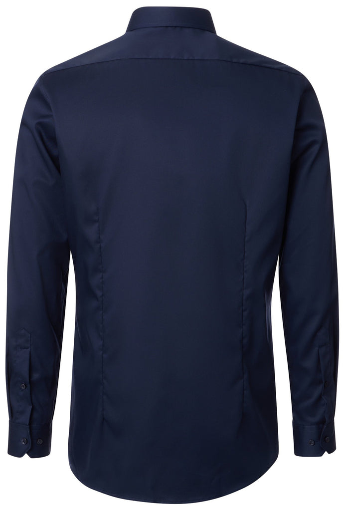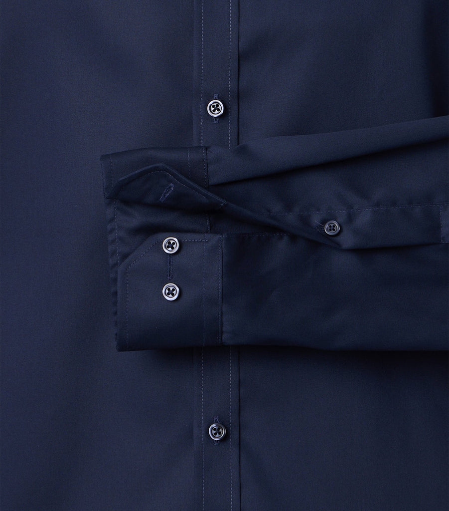 Het hemd is van 100% katoen en van een twill weving. Overhemden van een twill stof zijn te herkennen aan het diagonale weefpatroon, dat er voor zorgt dat het overhemd stevig en ademend is. De Kent boord is een klassieke, rechte boord: stijlvol en elegant. Het donkerblauwe overhemd heeft een body fit pasvorm. Dat wil zeggen dat het sterk getailleerd is. Bovendien is het overhemd non-iron, oftewel strijkvrij. Dat is wel zo makkelijk.